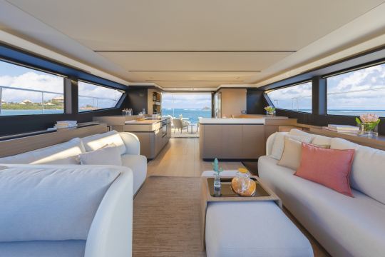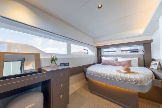 All'interno, il salone e la cucina sono stati riorganizzati per creare una disposizione più fluida tra la preparazione dei pasti, la zona pranzo e il salone. Il modello è disponibile in 3 o 4 cabine, ciascuna con bagno privato con doccia. La versione a 3 cabine si concentra su una cabina armatoriale in stile suite, con letto matrimoniale e spazio di stivaggio. L'equipaggiamento standard comprende un frigorifero a doppia porta di tipo domestico, un fornello a gas a 4 fuochi, un forno a microonde a convezione e piani di lavoro in Avonite.