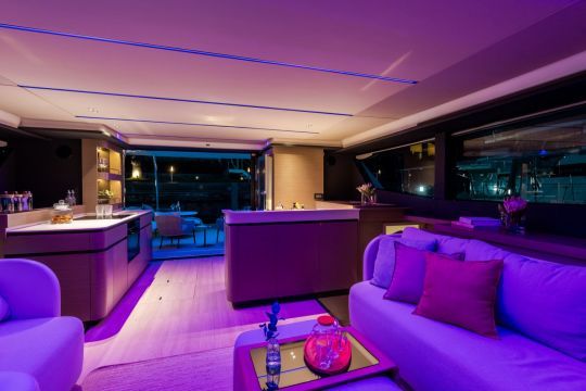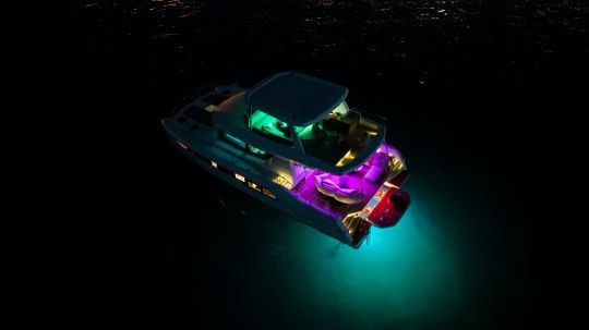 Il flybridge è dotato di un'area di seduta più spaziosa, di schienali regolabili e di una postazione di guida che si dice sia stata rielaborata per migliorare la visibilità e l'ergonomia. È stato integrato un modulo bar e cucina esterna, con lavello, grill e refrigerazione. Anche l'illuminazione è stata menzionata, con un'illuminazione ambientale e di servizio integrata nel flybridge, utile per le manovre notturne e la vita all'ancora.
