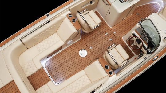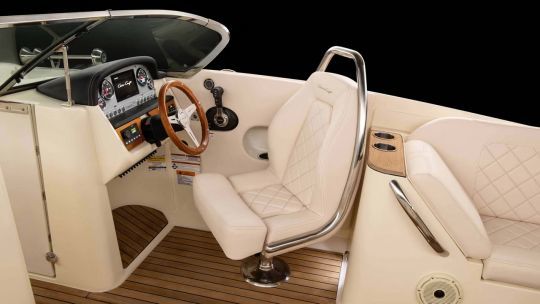 Il layout del ponte adotta una configurazione bowrider. A prua, una zona a U accoglie i passeggeri con panche e cuscini. Il pozzetto centrale comprende due sedili a secchiello al timone e a babordo. Gli schienali sono più ampi e incorporano un punto di appoggio in acciaio inox.