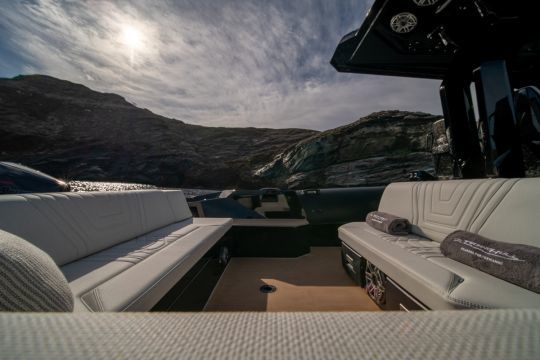 La barca ha un walkaround completo. È possibile avanzare senza scavalcare i sedili. A prua, un prendisole a U occupa il ponte di prua, completato da una panca di prua integrata nella console centrale.