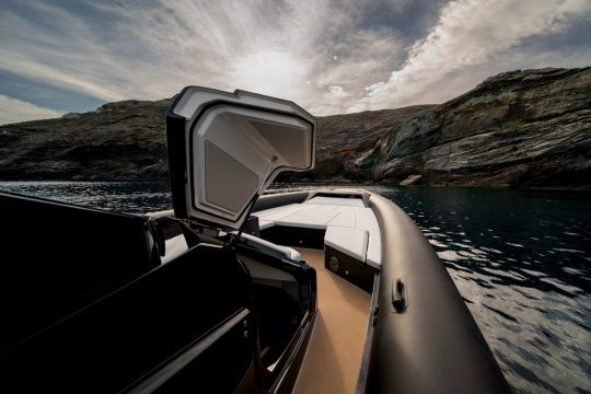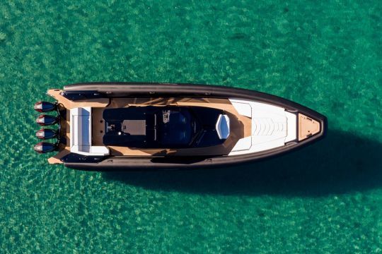 Il secondo punto chiave è il rapporto tra baglio e lunghezza. Con un baglio di 4,30 m per una lunghezza fuori tutto di 13,80 m, l'Alpha 45 ha un baglio generoso per un RIB (anche per un RIB sportivo). Questa scelta dà struttura al layout di coperta.