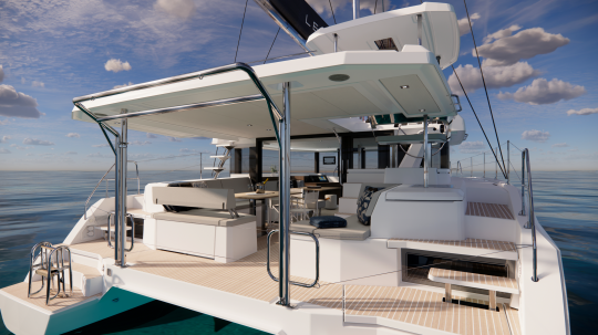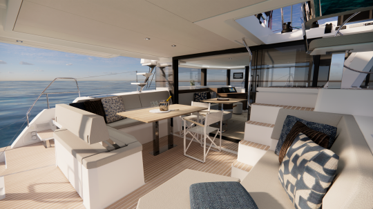 Un'altra modifica degna di nota è lo spostamento in avanti della lounge sul tetto, in modo che sia a contatto con la plancia di comando. Questo avvicina il timoniere e i passeggeri. Su un catamarano progettato per la crociera in famiglia o per il charter, questa vicinanza cambia spesso l'atmosfera a bordo e facilita la comunicazione durante le manovre.