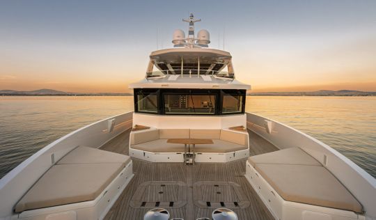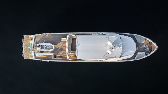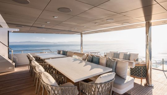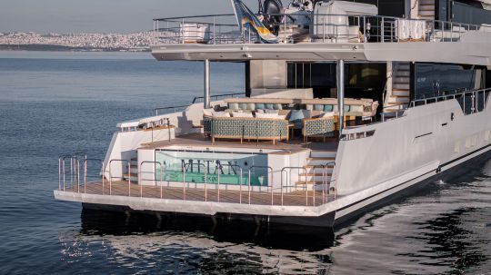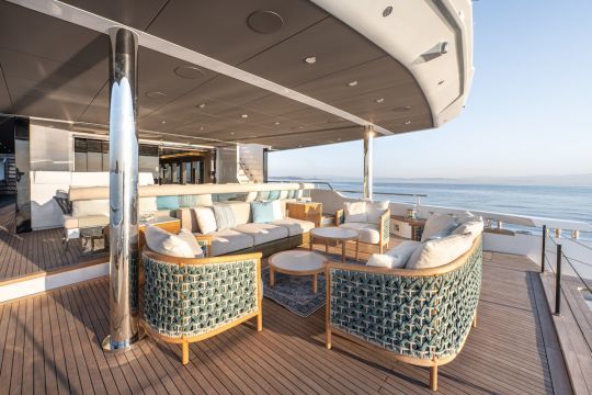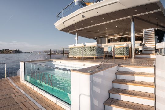 La poppa è il fulcro di gran parte del design. Ci sono tre livelli, dal pozzetto alla piattaforma da bagno. Vi sono una zona pranzo, un'area lounge con piscina e un accesso diretto al mare.