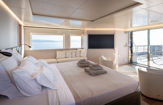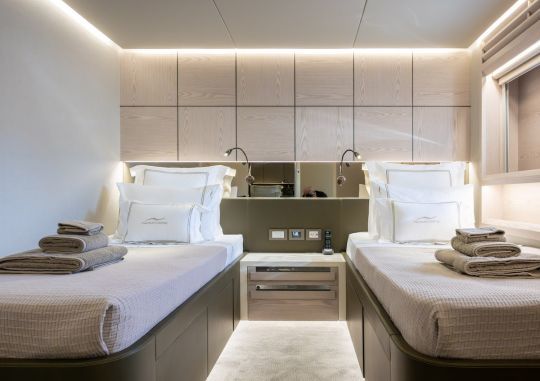 Il layout interno offre sei cabine per dodici passeggeri, con una suite armatoriale al piano terra sul ponte principale. Due cabine offrono un'interessante modularità. Possono essere utilizzate come camera da letto per bambini, ufficio o cabina aggiuntiva.
