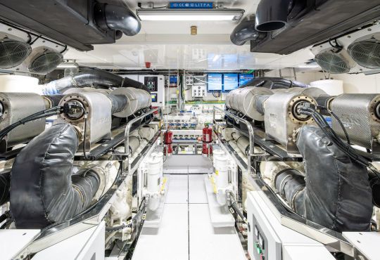Il sistema di propulsione si basa su due motori MAN da 800 CV, con un'opzione per 900 CV. Si tratta di una scelta classica per uno yacht di questa stazza. Favorisce l'affidabilità e il consumo controllato di carburante a velocità moderate.