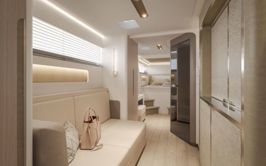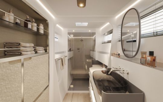 La disposizione delle cabine distingue chiaramente le diverse destinazioni d'uso. Lo scafo di babordo ospita una suite armatoriale a prua, completata da una cabina di poppa per gli ospiti o l'equipaggio. A dritta, una cabina doppia di poppa dispone di un'area lounge privata, mentre un'altra cabina doppia si trova a prua.