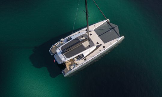 Con un baglio di 10,20 m, il catamarano dispone di un ampio volume sul ponte principale. Il salone ha una disposizione aperta, con la cucina, il salone e la sala da pranzo nello stesso spazio. Le aperture vetrate garantiscono la continuità visiva con l'esterno e facilitano gli spostamenti.