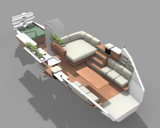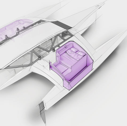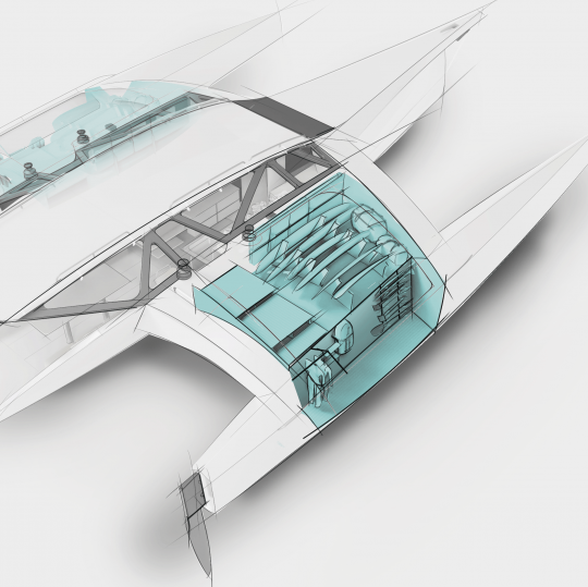 Gli interni del trimarano seguono la stessa filosofia. I bracci di collegamento diventano volumi utilizzabili, in grado di ospitare una varietà di moduli.