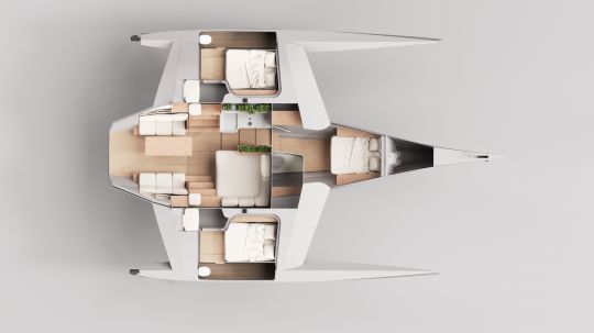 Cabine in stile loft, spazi di stivaggio per le attrezzature nautiche o allestimenti specifici, ogni configurazione risponde a un uso specifico. L'imbarcazione può evolvere da un programma di crociera sportiva a una piattaforma dedicata alle attività sportive acquatiche.