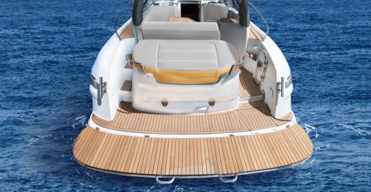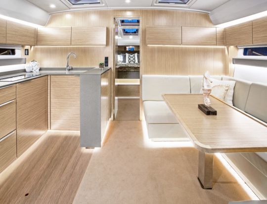 La dotazione di serie comprende anche un verricello elettrico, lettini prendisole e una doccia in pozzetto. Queste caratteristiche sono chiaramente rivolte alla sosta breve, alla giornata in baia o all'ancoraggio per il pranzo. All'interno, Bavaria Yachts ha scelto rovere nordico chiaro, pavimenti in wengé e materassi in schiuma fredda per le cuccette. L'impianto audio Fusion è installato sia nel pozzetto che nel salone.