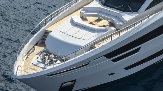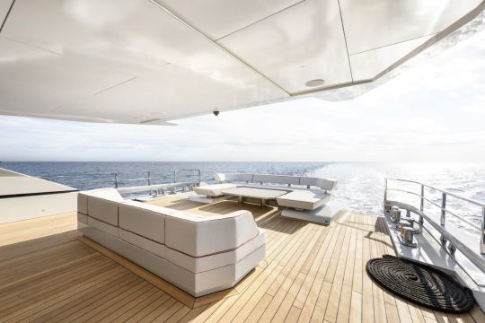Il prendisole, con una superficie di oltre 50 m², combina diverse funzioni: una zona d'ombra sotto l'hard-top, aree per prendere il sole e una vasca idromassaggio. Un bar e uno schermo retrattile consentono di passare all'uso serale. Sono inoltre integrati due sedili per il timone, che offrono una posizione di navigazione avanzata.