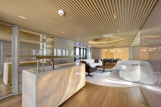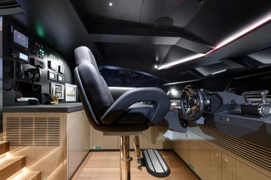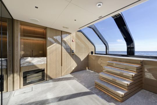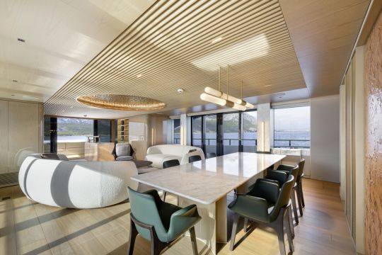 Il design degli interni, creato da Yodezeen con i team del cantiere, si basa su un'estetica da loft. L'onice avorio è utilizzato sia per il bar che per il tavolo da pranzo, mentre il pavimento in rovere riprende i ponti esterni in teak.