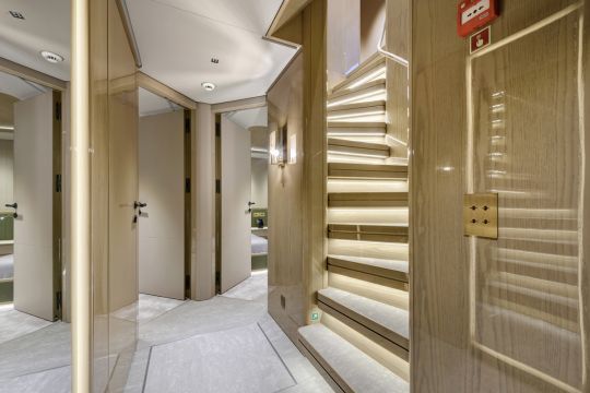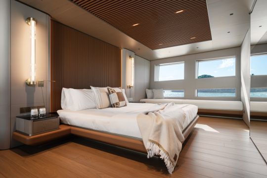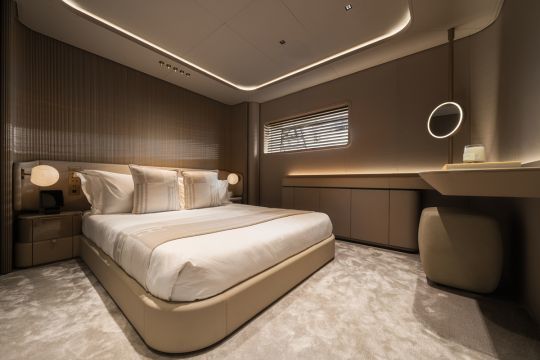 La suite armatoriale, situata nella parte anteriore del ponte principale, supera i 50 m². Comprende due bagni collegati da una doccia centrale e uno spogliatoio a tutta larghezza. Le cabine degli ospiti seguono le stesse linee, con variazioni di materiali come il travertino e il marmo.