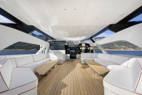 A prua, il ponte presenta un salotto organizzato attorno a due tavolini, in una configurazione a diamante. A poppa del ponte principale, gli spazi si alternano tra aree coperte e aperte, con illuminazione integrata e schermo di proiezione. La disposizione può essere adattata in base all'ora del giorno.
