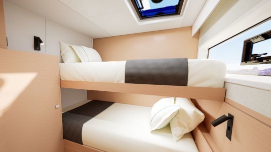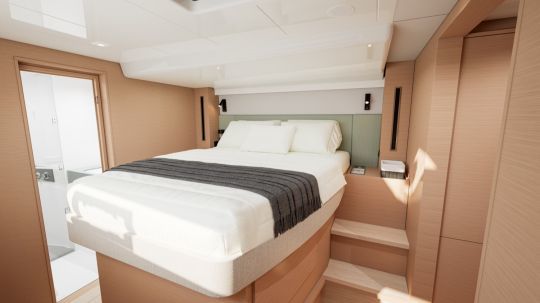 La cabina armatoriale dispone di un bagno con doccia, doppio lavabo e spazi ben distribuiti. Lo Smartroom nello scafo di babordo offre un'interessante modularità. Può essere utilizzato come cabina, spogliatoio o area tecnica, soddisfacendo le diverse esigenze di armatori e noleggiatori.