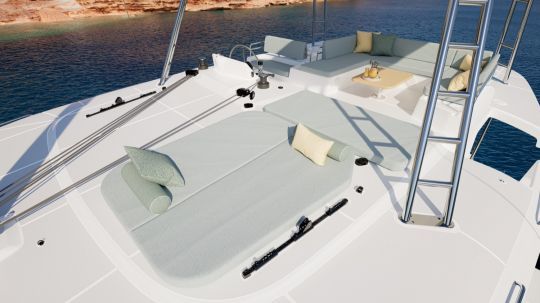 Il pozzetto di prua di 12 m2 diventa una vera e propria estensione del salone. Il suo accesso diretto ne modifica l'utilizzo, rendendolo ideale per il riposo o la guardia. Il flybridge aggiunge un terzo livello con un'area relax e una postazione di guida rialzata, aumentando sia la superficie utilizzabile che il guadagno.
