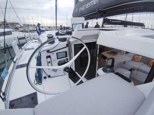 L'Outremer 48 ha una configurazione mista, con timone a ruota inclinata a sinistra e timone a barra a dritta.