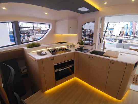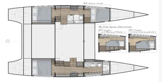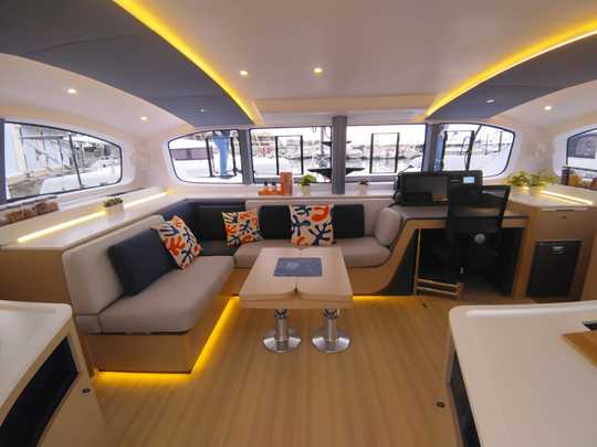 La disposizione interna prevede due cabine per scafo, con servizi igienici separati. I servizi igienici e le docce sono separati, per facilitare la vita a bordo di più persone.