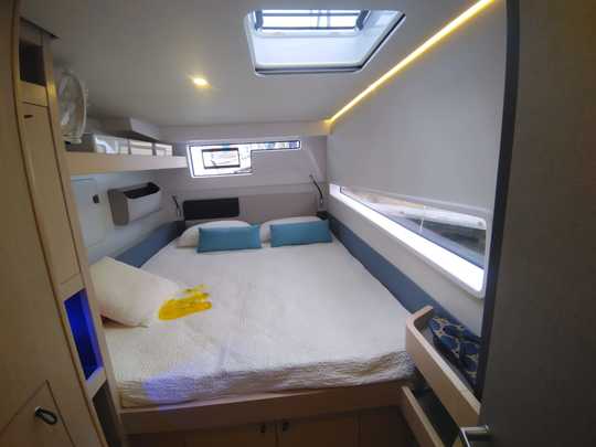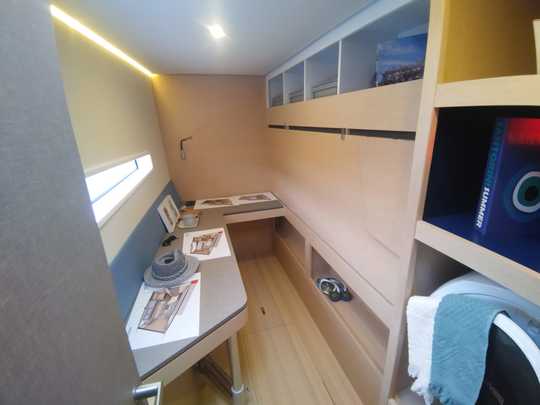 La cabina di prua a babordo è caratterizzata dalla modularità. Ufficio, cuccetta doppia, letti a castello, le configurazioni variano a seconda del programma. Per un equipaggio familiare o per gli ospiti in visita, questa flessibilità offre una soluzione reale.